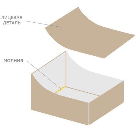 Из флока шьем чехол. Для этого на ткани делаем разметку, соответствующую габаритам подушек с припуском 1 см, разрезаем ее на прямоугольники и полосы, сшиваем вместе. На стыке полос и одного из прямоугольников устанавливаем молнию.