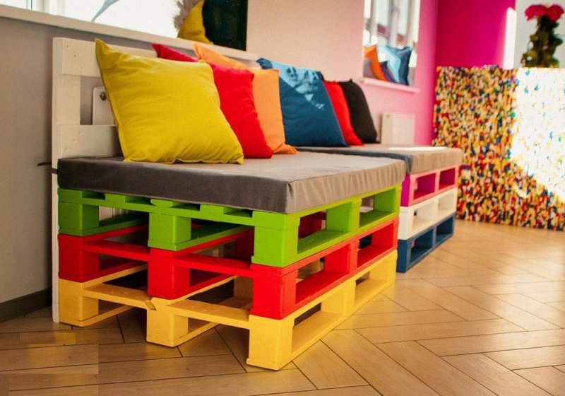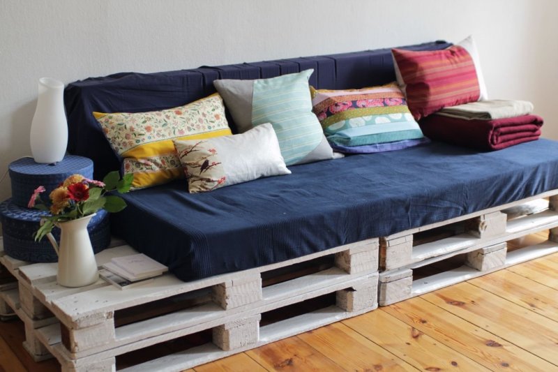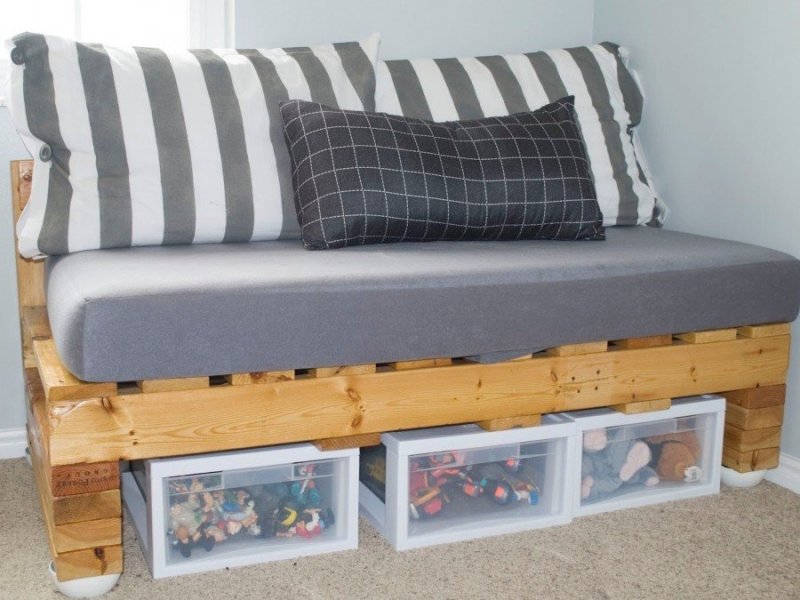 Помимо интерьерного назначения, диван из поддонов очень функционален. Он удобен в использовании. Сделав сиденье из мягкого поролона и подушек, его легко превратить в еще одно спальное место. Можно получить дополнительные полочки для хранения домашних мелочей, если накрыть листом фанеры перегородки.