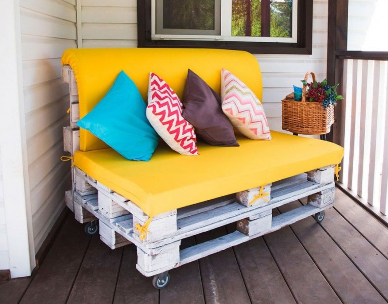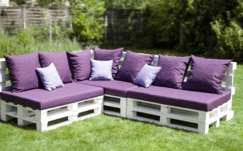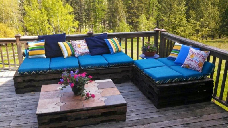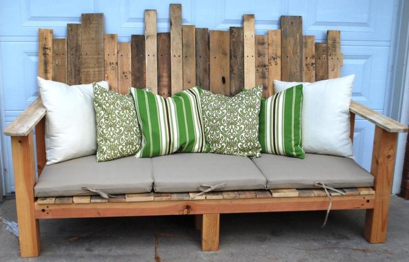 Мебель должна гармонировать с интерьером комнаты и мягкими деталями. Если тахта выкрашена лаком, лучше украсить ее текстилем, имитирующим фактуру мешковины, можно использовать светлые, клетчатые сиденья. К однотонному темному каркасу подойдут яркие подушки. Диван из поддонов на даче будет выглядеть по-домашнему, если сделать обивку с цветочным принтом.