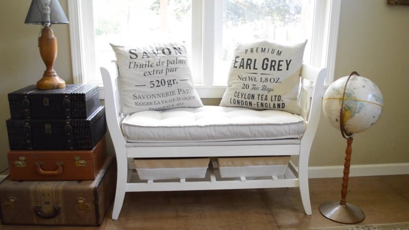 Из двух стульев с прямыми спинками получится красивый диванчик в текстильном чехле. Снимаем с них сиденья, фиксируем между собой скотчем, возвращаем на место. Если спинки с большим просветом, его можно заполнить пластиковыми бутылками, примотав скотчем. Обшиваем конструкцию поролоном или синтепоном, затем любой подкладочной тканью. Для красоты накрываем чехлом.