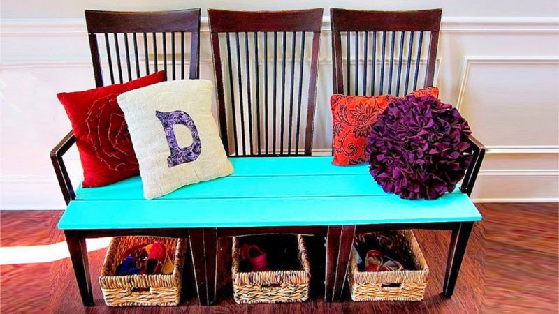 Для работы понадобятся четыре стула с изогнутыми спинками, саморезы, лак. Разбираем два предмета, у оставшихся отпиливаем передние ножки. Снимаем старое лаковое покрытие при помощи наждачной бумаги со всех рабочих элементов будущей конструкции. Прикрепляем к стульям без ножек разобранные перекладины от средней части. Целые спинки играют роль боковушек. Покрываем диванчик лаком и устанавливаем на место сидений разноцветные рейки.