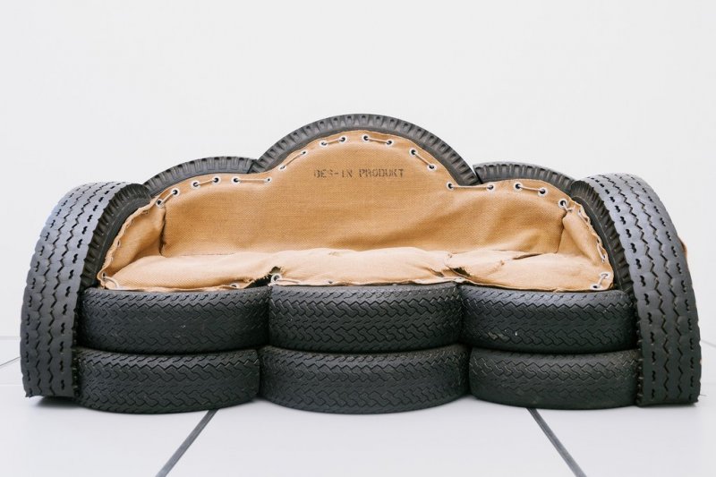Такой миниатюрный диван из покрышек отлично впишется в интерьер гаража, дополнит гостиную лофт. Для его изготовления потребуется большая шина от грузового автомобиля, деревянные бруски для спинки, лист фанеры, поролон, обивочная ткань. Из простого подручного материала можно сделать мягкий текстильный диван или оставить резину в начальном виде и сделать стильный и удобный предмет.
