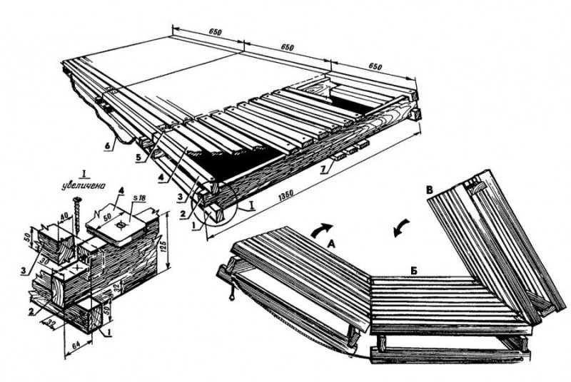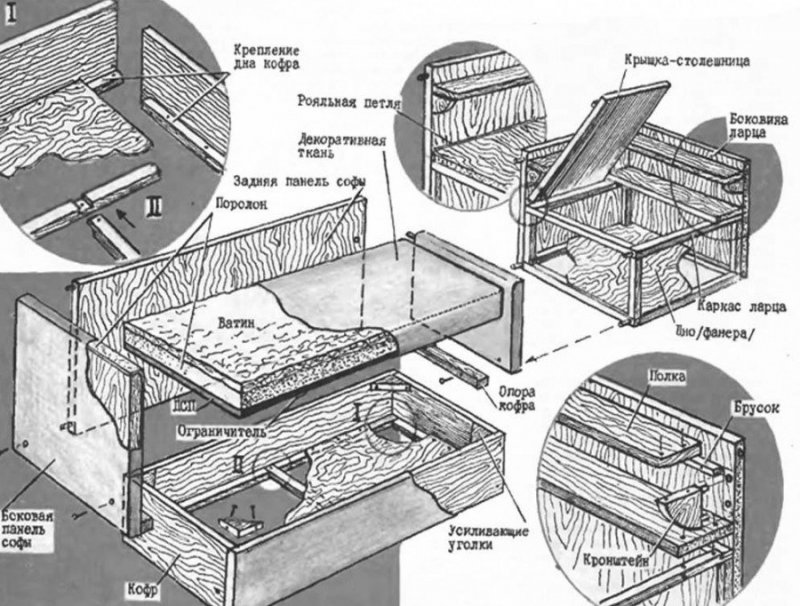 Начинать работу следует с подготовки чертежа. Изготовленные детали конструкции необходимо пронумеровать и разложить на полу. Сборку начинаем с самых больших деталей, постепенно добавляя. Крепить дерево лучше шурупами и клеем. Для фиксации механизма подъема необходимо просверлить отверстия в донной части и прикрутить ящики. Готовую конструкцию обклеивают поролоном, агротекстилем для утяжки и обивкой.