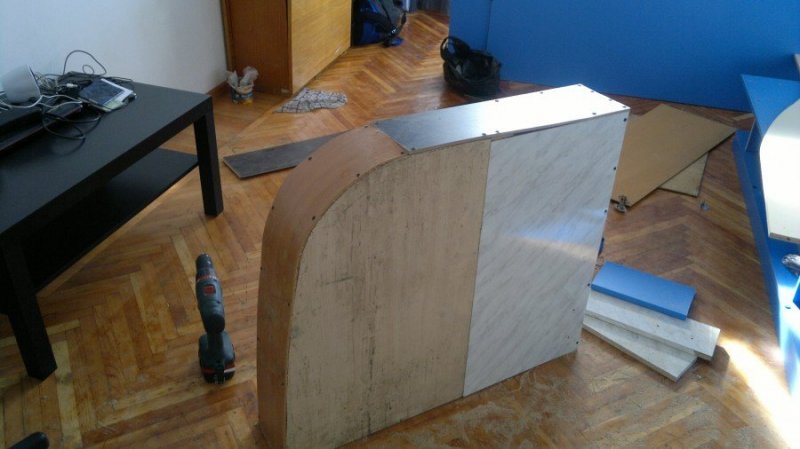 Сборка модульной конструкции начинается с подлокотников. Именно эти, самые маленькие детали нуждаются в особенном внимании. Чтобы они получились идеально ровными, симметричными, надо четко следовать чертежу и аккуратно выпиливать размер из ламинированных плит. Для соединения деталей используют саморезы.