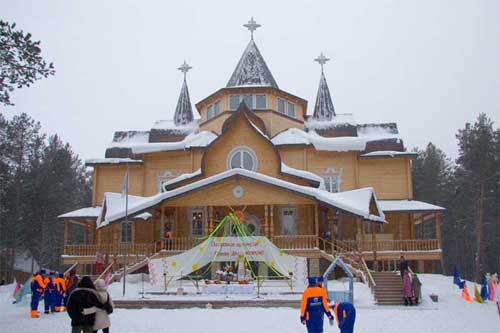 Усадьба Деда Мороза в Великом Устюге Вотчина Деда Мороза расположена примерно в 15-ти километрах от Великого Устюга, на берегу реки Сухона. Вход в вотчину закрывают небольшие резные ворота, за которыми начинается «тропа сказок», а она ведет прямиком к дому Деда Мороза. Сам терем выполнен в традиционном русском стиле и сделан полностью из дерева. В доме есть все для удобства Деда Мороза, Снегурочки и их помощников. А в одной из комнат этого терема состоялась историческая встреча Деда Мороза и Санты Клауса, во время которой было подписано новогоднее обращение к детям всей земли.