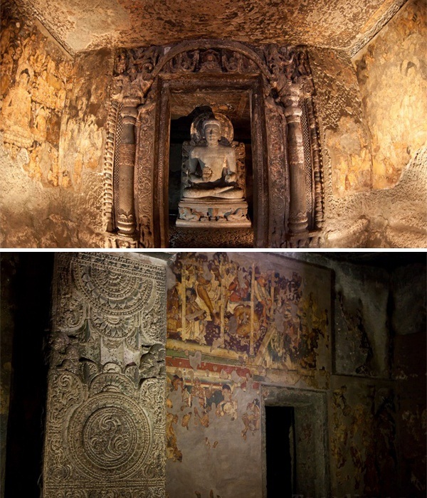 Примечание: «Пещеры Эллора» насчитывают 34 культовых объекта: 12 из них являются буддийскими храмами, 17 – индуистскими и 5 – джайнистскими религиозными сооружениями, которые вырубались в базальтовой породе скал в таком же хронологическом порядке.