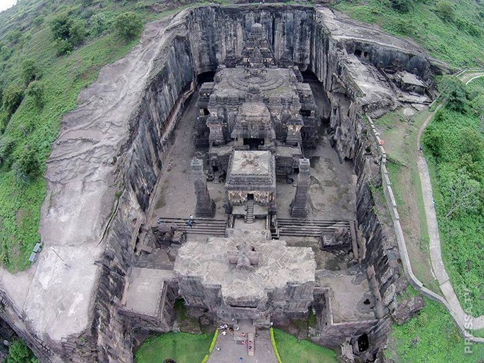Мегалитический храм Кайласанатха, созданный из единого камня гигантских размеров, считается самым таинственным и впечатляющим пещерным культовым объектом Индии и всего мира. Огромное сооружение является одним из 34 пещерных храмов и монастырей, которые создают ансамбль более известный как «Пещеры Эллора». Уникальные пещеры, датируемые 600-1000 гг., стали главной достопримечательностью страны, к которой устремляются не только миллионы туристов, но и группы исследователей, пытающихся разгадать тайну их создания. Храм Кайласанатха был вырезан из целого куска базальтовой скалы (комплекс «Пещеры Эллора», Индия). | Фото: bigpicture.ru. Эллора — это небольшая деревушка, расположенная в индийском штате Махараштра, недалеко от города Аурангабад, стала известна на весь мир благодаря уникальному мегалитическому ансамблю, состоящему из 34 пещерных храмов и монастырей. Причем не только высокохудожественная ценность древних объектов делает это место настолько значимым для мирового культурного наследия. Как оказалось «Пещеры Эллора» являются свидетельством мирного сосуществования трех различных религий – индуизма, джайнизма и буддизма. Святилище, высеченное из монолитной скалы и украшенное резьбой, занимает площадь 1980 м? (Kailasanatha, Индия). | Фото: weekend.rambler.ru. Примечание: «Пещеры Эллора» насчитывают 34 культовых объекта: 12 из них являются буддийскими храмами, 17 – индуистскими и 5 – джайнистскими религиозными сооружениями, которые вырубались в базальтовой породе скал в таком же хронологическом порядке. Храм Кайласанатха входит в комплекс «Пещер Эллора» и является объектом Всемирного наследия ЮНЕСКО (Kailasanatha, Индия). | Фото: mymodernmet.com. В этом комплексе каждый из пещерных храмов или монастырей поражает своим размахом и удивительными формами, но наиболее впечатляющим считается храм Кайласанатха (Кайлаш). Известный своими гигантскими размерами, способом создания и впечатляющим орнаментом этот шедевр мировой архитектуры вызывает множество вопросов, ведь до сих пор не совсем понятно, кто построил уникальный храм в Кайласе. Храм начали вырезать из горной породы с его вершины (Храм Кайласанатха, Индия). | Фото: pressa.tv. У исследователей нет никаких документальных подтверждений и убедительных версий по этому поводу. Большинство ученых приписывают это Рахтракуте, царю Кришне I, который правил примерно с 756 по 773 год н.э. Каждый резной элемент несет смысловую нагрузку и прославляет одного их трех богов (Kailasanatha, Индия). | Фото: feel-feed.ru. Поскольку научно ничего ещё так и не доказано, здесь уже много веков подряд передают из уст в уста средневековую легенду, которая была написана в «Катха-Калпатару» (древний трактат из Вед) Кришной Яджнавалки: «Когда царь был тяжело болен, его королева молилась богу Шиве, чтобы ее муж выздоровел. В обмен на его здоровье королева поклялась построить храм во имя Шивы и поститься до тех пор, пока не будет завершена шикхара (вершина храма). Король быстро поправился, и началось строительство храма, но, к ужасу супругов, оказалось, что для появления шикхары понадобятся годы. К счастью, один изворотливый инженер пришел и объяснил, что, начав с вершины горы, он может сделать купол храма в течение недели. Это очень помогло королеве, которая могла быстро закончить ее пост, и поэтому храм был построен сверху вниз». Уникальный храм Кайласанатха соз