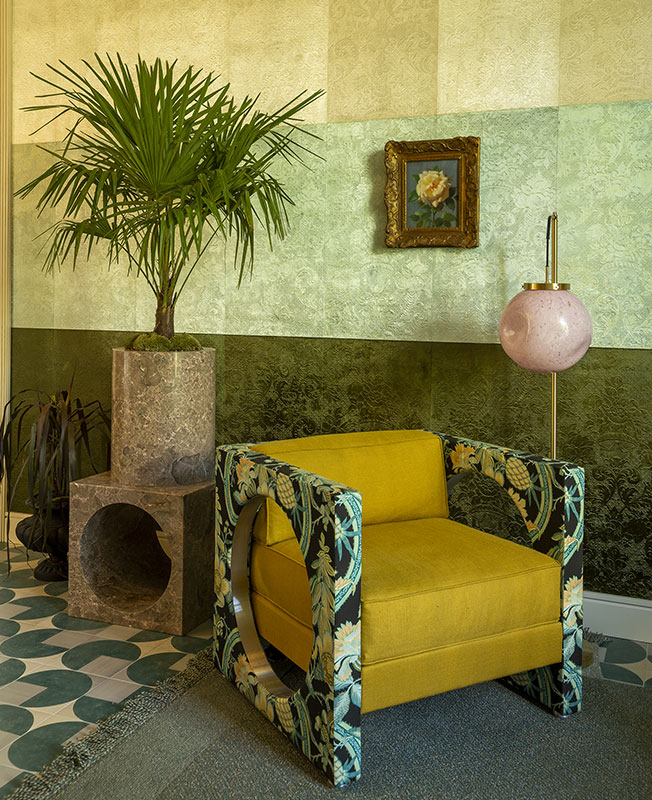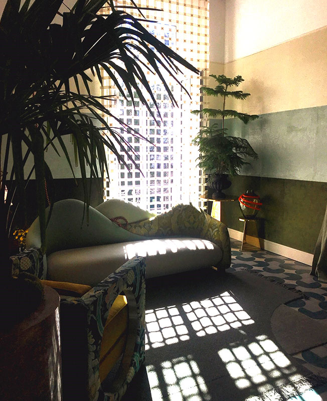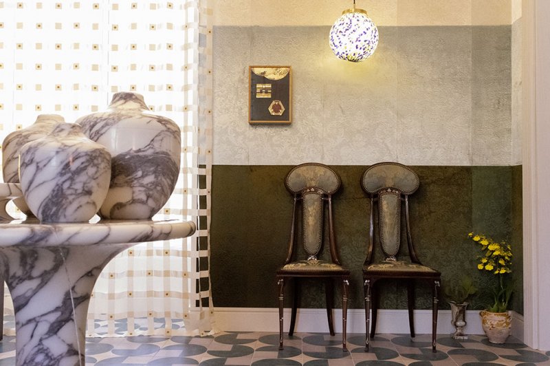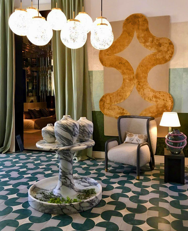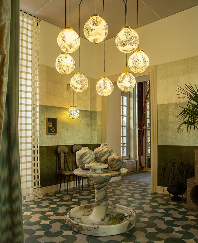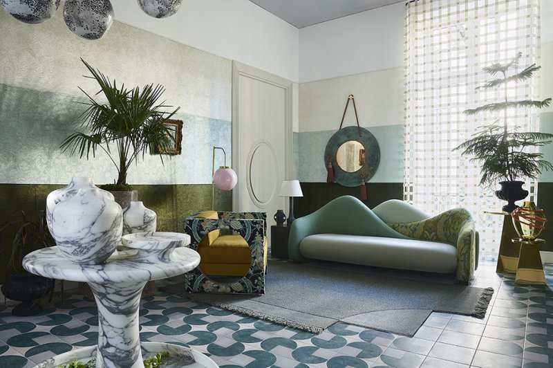 Для сценографии Пьер Гоналон окружил себя престижными брендами и знающими свое дело мастерами, укрепляя личную историю сотрудничества с Pierre Frey и Paradisoterrestre, представляя Ceramica Bardelli и Tai Ping.
