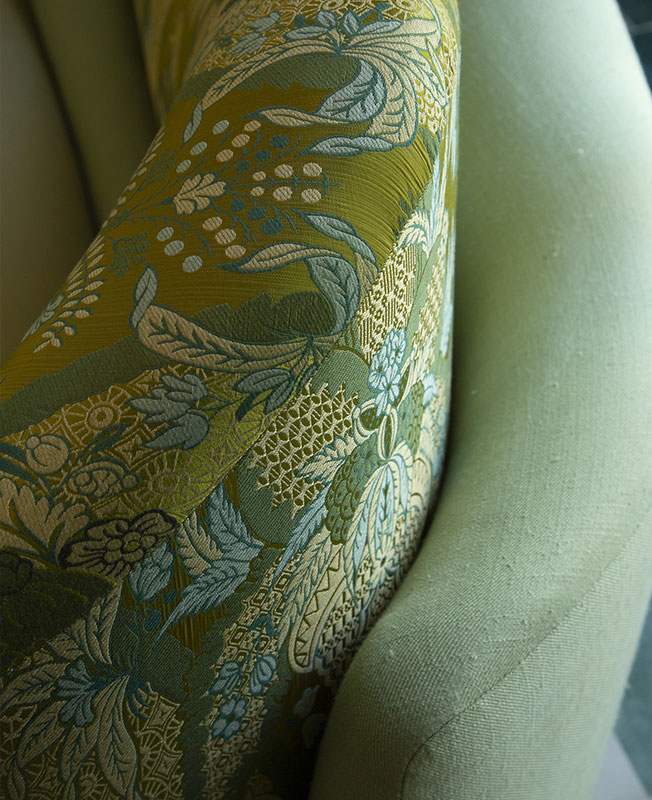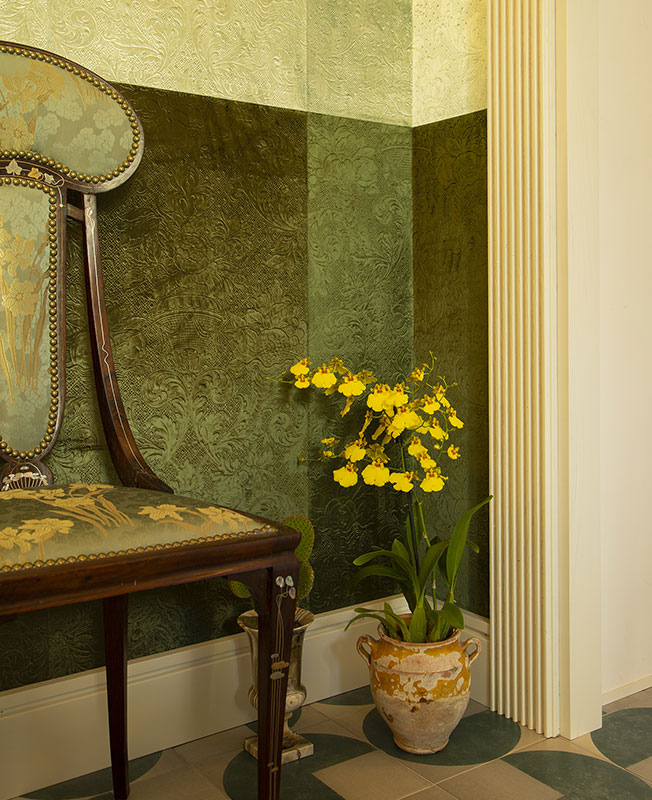 Его сад архитектурен. Вертикальные панели из бархатных обоев с тиснением смешаны с плитками в виде шахматной доски, занавесом с ручной вышивкой, с волнистыми формами дивана. Мягкие изгибы элементов бельэпок объединяются, чтобы создать общий стиль.