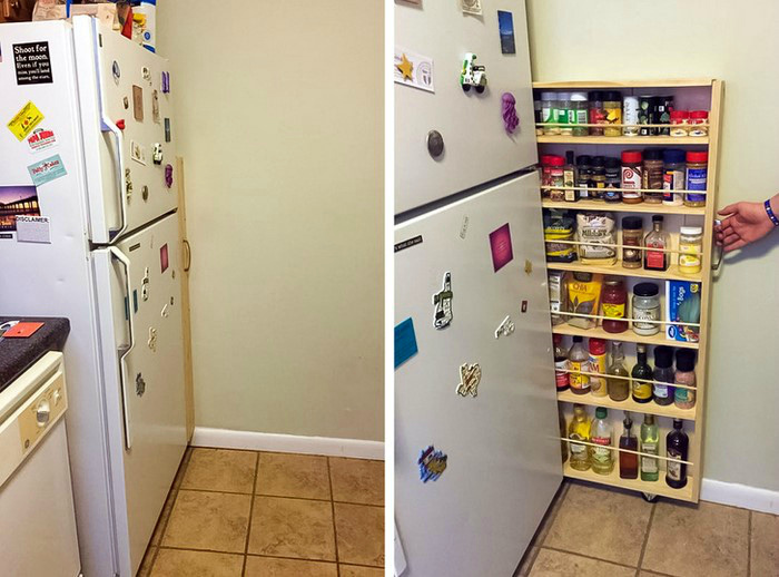 Узкая выкатная полка. | Фото: Zinoti.lt. У хорошей хозяйки на кухне нет ни одного лишнего уголка, более того, ей всегда не хватает места. Если вы одна из таких, обратите внимание на узкую выкатную полку. Ее компактный размер позволит разместить ее даже в небольшом зазоре, который всегда присутствует между холодильником и стеной и использовать для хранения баночек со специями и бутылок с соусами.