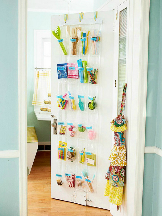 Хозяйственный органайзер на двери. | Фото: AdMe. Любую межкомнатную дверь можно превратить в функциональную систему хранения, закрепив на ней хозяйственный органайзер из ткани или клеенки.