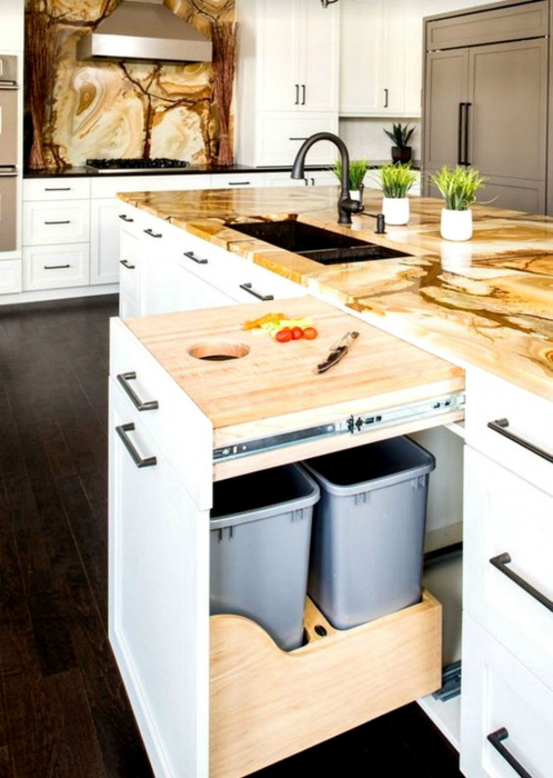 Необычный шкафчик с разделочной доской и мусорным контейнером. | Фото: The Cottage Market. Потрясающий пример грамотного обустройства кухни с целой выдвижной системой, которая состоит из разделочной досочки и мусорного контейнера, скрытых за классическим фасадом кухонного шкафчика.