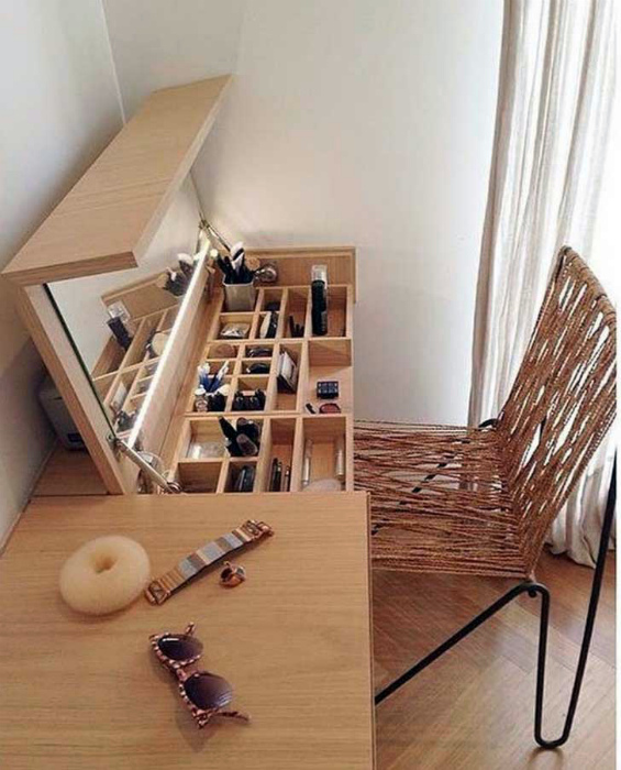 Стол с сюрпризом. | Фото: Тутка. Классический рабочий стол, который в два счета превращается в трюмо с большим зеркалом и вместительным органайзером для косметики.