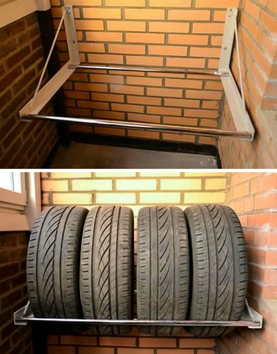 Полка для автомобильных шин. | Фото: Boom.ms. Если у вас есть автомобиль, но нет личного гаража, вы обязательно столкнетесь с вопросом хранения сезонной резины. По мнению Novate.ru, решить проблему поможет простая металлическая конструкция. Закрепите ее на одной из стен балкона и аккуратно поставьте сменные шины.
