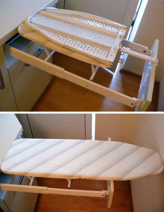 Выдвижная гладильная доска. | Фото: Viikonloppu.com. В разложенном виде гладильная доска занимает достаточно много места. Хранить ее в таком виде - непозволительная роскошь для владельцев маленьких квартир. В таких условиях лучше обратить внимание на компактную складную доску, интегрированную в один из шкафчиков гарнитура.
