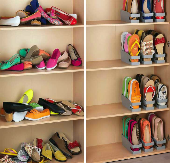 Вертикальное хранение обуви. | Фото: Pinterest. Летнюю обувь на низком ходу можно хранить в специальных картонных подставках для обуви. Такой прием позволит навести порядок в шкафу и избавится от множества обувных коробок.