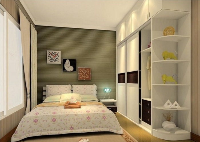 Или, в крайнем случае, воспользуйтесь «услугами» маленького прикроватного столика светлого оттенка на высоких ножках. Он не займет много места и за счет своего внешнего вида добавит комнате легкости и изящества. Освободившиеся метры используйте для размещения компактного шкафа-купе либо комода: в них поместится намного больше вещей, чем на тумбочке, да и композиция будет смотреться очень гармонично.
