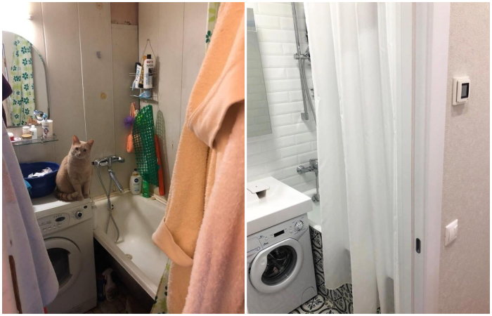 Владельцы квартир в многоэтажках, построенных в эпоху массовой застройки, не понаслышке знают, что в ванной или туалете сделать лишний шаг или движение практически невозможно. Некоторым «счастливчикам» повезло иметь совсем уж крошечное пространство, поэтому они изо всех сил стараются расширить площадь за счет объединения этих двух зон. Интересный вариант перепланировки предложила одна семейная пара, которой надоела теснота и непрезентабельный вид санузла и ванной. Так выглядела крошечная ванна комната, в которой предстояло сделать перепланировку и ремонт. | Фото: infodays.ru. Советское наследие в виде многоэтажных домов, которые массово возводились в кратчайшие сроки и с минимальным набором удобств, еще не одно десятилетие будет преподносить сюрпризы и проблемы владельцам квартир. Самый большой минус такого жилья – крошечные размеры санузлов и ванных комнат. Как правило, эти две вместе взятые зоны занимают от 3 до 4 м?. Согласитесь, это катастрофически мало, если в квартире живет семья и нужно пристроить бытовую технику и сантехническое оборудование, как минимум унитаз, раковину, ванну/душевую, стиральную машину и водонагреватель. Туалет совсем был в плачевном состоянии. | Фото: infodays.ru. Осыпающаяся побелка с потолка и пластиковая облицовка стен в ванной – грустное зрелище. | Фото: lemurov.net. Семья, которая 8 лет назад купила такого плана квартиру, наконец смогла выкроить средства и время, чтобы сделать в ней ремонт. Первым делом нужно было решать с ванной комнатой, в которой на стенах вместо кафельной плитки пластик, а на потолке обычная побелка, смотрелось все это не очень презентабельно. В санузле не лучше состояние – где-то уже потрепались обои, плитка не в лучшем состоянии, да и унитаз требовал срочной замены. Поскольку эти две комнаты находятся рядом, решились все-таки на объединение. В туалете решили убрать перегородку и объединить с ванной комнатой. | Фото: lemurov.net. Совет от Novate.Ru: Перед началом подобных работ нужно определить, не является ли стена, которую собираетесь сносить, несущей (в панельных домах такое случается крайне редко), а потом обратиться за разрешением в Государственную жилищную инспекцию и БТИ. Иногда эти службы могут потребовать составления проекта, что повлечет за собой большие финансовые вложения. Короб, за которым скрыты все коммуникации, облицевали такой же плиткой как на полу, сделав на него акцент. | Фото: syl.ru. После сноса стены супруги сняли обои, плитку, панели и слой штукатурки на потолке. Естественно, под всем этим оказалась жуткая картина, и поэтому пришлось выравнивать все поверхности, прежде чем начинать двигаться дальше. Чтобы визуально увеличить пространство, было решено оформлять объединенную зону в светлых тонах. Ванну оставили на том же месте, только заменили на новую и облицевали стены и перегородку кафелем. | Фото: infodays.ru. Чтобы немного разбавить белоснежный тон, на пол решили положить кафель с черным рисунком. Учитывая, что в туалете был сделан короб, за которым спрятаны все коммуникации, после сноса стены он стал заметным и его решили облицевать такой же плиткой как и пол. После перепланировки удалось установить рукомойник над стиральной машиной. | Фото: syl.ru. Саму ванну заменили, пространство под ней заложили кирпичом и облицевали напольной плиткой. Стены же покрыли белой керамической плитко