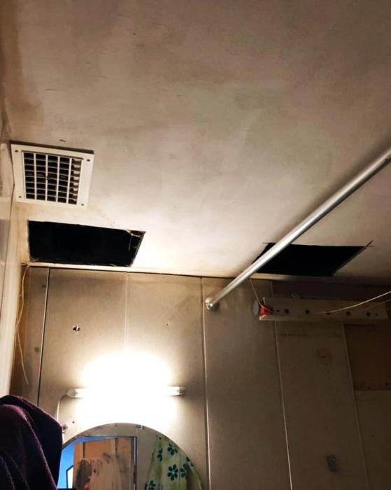 Осыпающаяся побелка с потолка и пластиковая облицовка стен в ванной – грустное зрелище. | Фото: lemurov.net.