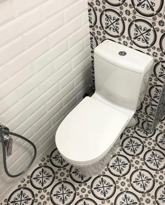 Чтобы немного разбавить белоснежный тон, на пол решили положить кафель с черным рисунком. Учитывая, что в туалете был сделан короб, за которым спрятаны все коммуникации, после сноса стены он стал заметным и его решили облицевать такой же плиткой как и пол.