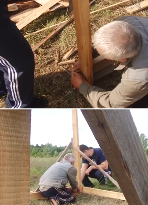 Вместе с соседом Владимир Крысанов установили четыре опоры по углам будущего дома и закрепили по уровню. | Фото: youtube.com/ Взгляд слепых. Узнав о таком решении мужчины, многие люди по доброте душевной помогали, чем могли. На пилораме, где покупал доску, сделали скидку и разрешили хранить материал столько, сколько было нужно Владимиру. Сосед помогал определить уровень и установить по углам четыре опоры, ведь дом он делал каркасным.