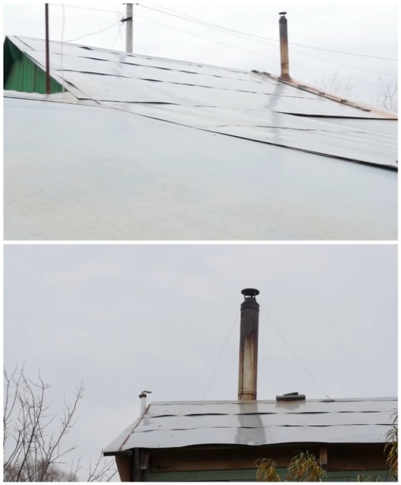 В качестве кровельного покрытия было выбрано рулонное железо, которое незрячий мужчина установил и закрепил сам (д. Зарытки, Рязанская обл.). | Фото: youtube.com/ FORUMHOUSE.