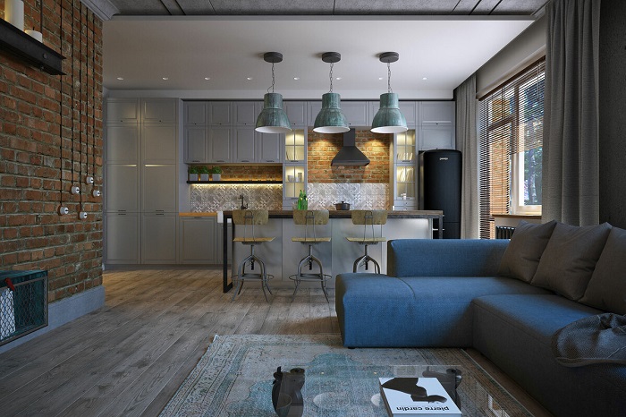 Кухня-гостиная в стиле лофт. / Фото: Kitchenremont.ru