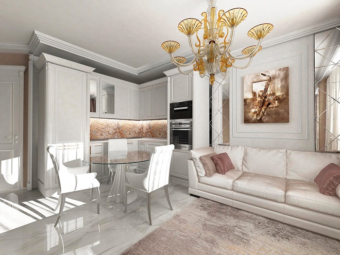 Роскошная и вычурная кухня-гостиная в стиле неоклассика. / Фото: Dizajn-gostinoj.com