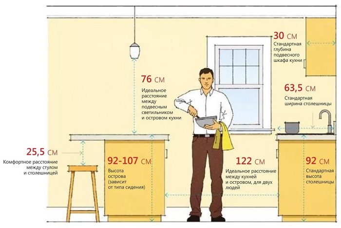 • Важно, чтобы проход между гарнитуром и кухонным островом составлял не менее 120 см, чтобы вы могли свободно передвигаться и не спотыкаться об углы.