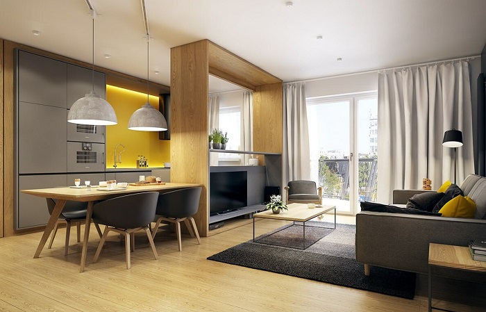 Дополнительным способом зонирования является отделка. Так как кухня и гостиная выполняют разные функции, оформление стен и пола также должно быть разным. Например, на кухне лучше использовать плитку или керамогранит, так как они являются более износостойкими, выдерживают повышенный уровень влажности и перепады температур. А вот для гостиной больше подойдет ламинат или паркет – эти материалы способны создать в комнате уютную атмосферу.