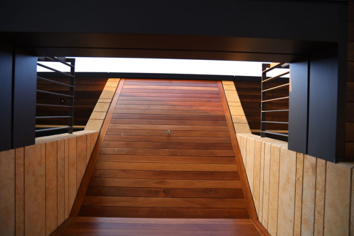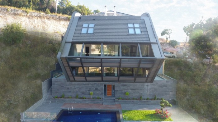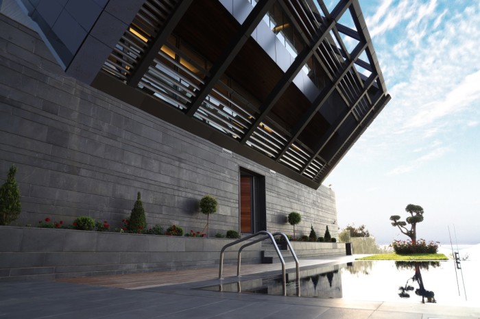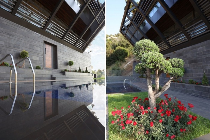 Изюминкой новой резиденции является бетонная дорожка, сменяющаяся ступенями, идущими с внешней стороны дома к пейзажному бассейну. Лестница имеет четкое ограничение, ведь сразу за опорно-защитной стеной начинается обрыв. Поэтому само спускание по этой дорожке-лестнице обеспечивает невероятными ощущениями, не говоря о бассейне, выложенном иссиня-черным гранитом придающим особенной глубины воде. С другой стороны дома на каждом уровне сделаны открытые террасы, на которые есть выходы с каждого этажа и яруса особняка.