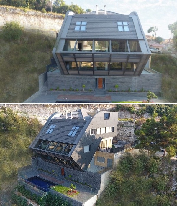 Если подъехать со стороны деревеньки Чнанир, то дом выглядит вполне современно и стандартно (CH730 Villa, Chnaniir). | Фото: newatlas.com. Подъездная улица со стороны населенного пункта упирается в ворота вполне обычного дома с современной планировкой. Но с северной стороны, находясь в долине у подножия горного хребта подняв голову вверх, можно действительно ужаснуться, ведь часть дома свисает над пропастью. И возникает стойкое ощущение, что дом вот-вот упадет с края утеса.