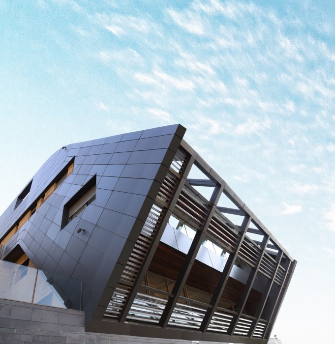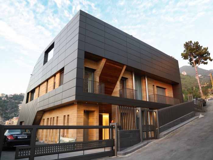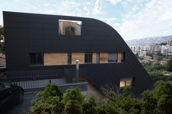 Фасад облицован натуральным деревом и композитными материалами (CH730 Villa, Chnaniir). | Фото: admiddleeast.com. Верхняя более объемная часть строения как бы обернута серой металлической облицовкой, которая контрастирует с деревянными панелями в нижней части виллы. Окна разных размеров расположены по всему фасаду, но большая часть остекления находится на половине «сползающей» по склону, чтобы максимально использовать необычное местоположение и создать невероятный визуальный эффект как снаружи, так и внутри.