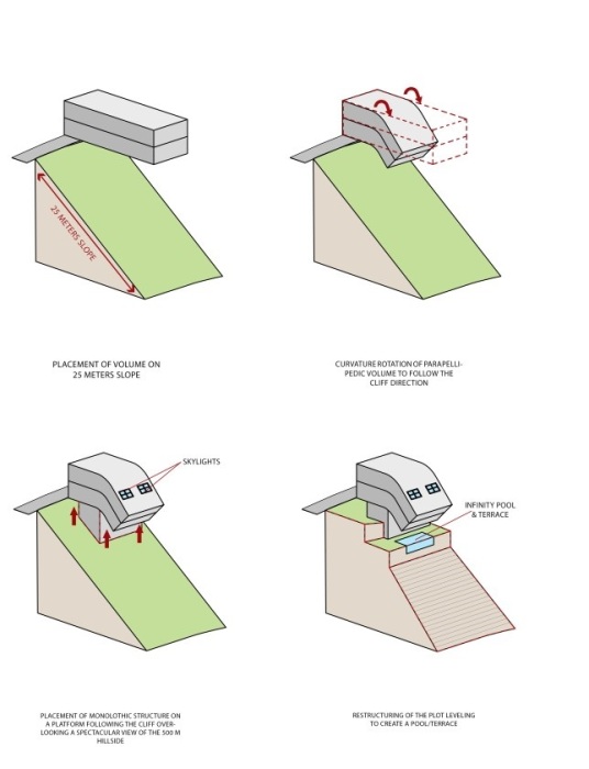 В итоге было решено делать дом на монолитно-бетонной платформе, которая повторяла очертания скалы. Тем самым они выполнили одно из условий и обеспечили обитателей дома захватывающими видами и на склоны холма, и на горную гряду. Чтобы дом более органично вписывался в окружающий ландшафт и бетонный массив меньше выделял углекислого газа цокольную платформу, как и бетонные части этажей облицевали легкими композитными материалами и деревом.