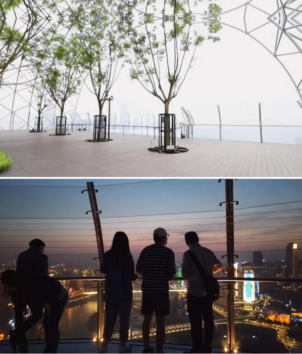 Все, кто добрался до «горизонтального небоскреба» попадает в райский уголок под небесами – в парк с экзотическими растениями. Прогулка по его аллеям принесет немало удовольствия даже тем, кто стремился только на площадку, ведь его стены тоже полностью прозрачны и оттуда открывается прекрасный вид как на город, так и на необычное слияние коричневых потоков Янцзы с синим цветом воды реки Цзялин.