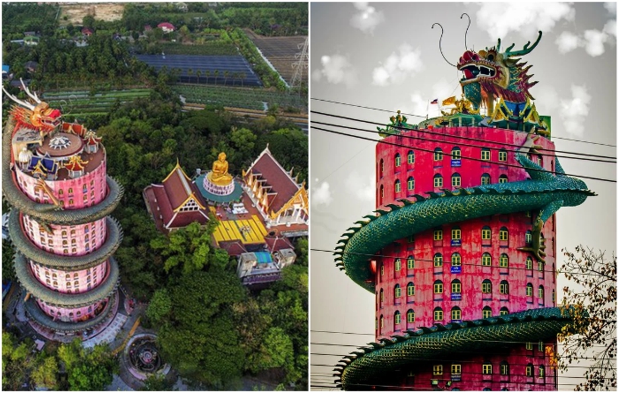 В небольшом старинном городке Накхонпатхом, расположенном в 50 км от Бангкока (Таиланд), находится уникальный буддийский храм Wat Samphran («Храм Дракона»). Его необычный внешний вид вводит в заблуждение тех, кто первый раз увидел это творение. 50-метровая башня с обвитым вокруг нее гигантским драконом больше смахивает на сказочный аттракцион в Диснейленде, нежели на религиозное сооружение. И такое впечатление возникает неспроста.