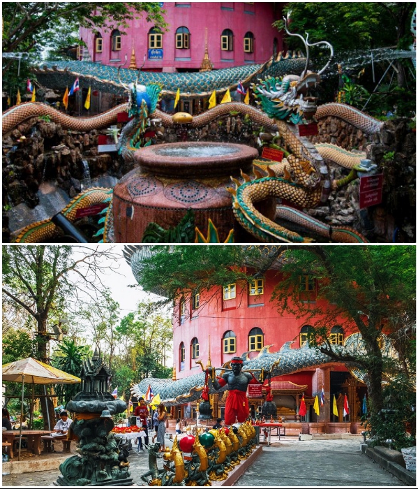 Храм «Wat Samphran» («Храм Дракона») — это самый необычный буддистский храм Таиланда, который до недавнего времени был закрыт для посещений из-за того, что священнослужители проводили на территории комплекса странные обряды. Хотя судебные разбирательства и были громкими, но после них храм вновь открыт для посещений и быстро стал местом паломничества туристов. И кто знает, что привлекает путешествующих больше – жуткие истории или возможность прикоснуться к хвосту дракона, бросить монету в «горшок счастья» или ударить в главный гонг для исполнения заветных желаний.