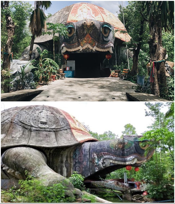 Храм «Wat Samphran» («Храм Дракона») — это самый необычный буддистский храм Таиланда, который до недавнего времени был закрыт для посещений из-за того, что священнослужители проводили на территории комплекса странные обряды. Хотя судебные разбирательства и были громкими, но после них храм вновь открыт для посещений и быстро стал местом паломничества туристов. И кто знает, что привлекает путешествующих больше – жуткие истории или возможность прикоснуться к хвосту дракона, бросить монету в «горшок счастья» или ударить в главный гонг для исполнения заветных желаний. Загадочный и скандально известный буддистский «Храм Дракона» открыл свои двери. | Фото: travelask.ru. В небольшом старинном городке Накхонпатхом, расположенном в 50 км от Бангкока (Таиланд), находится уникальный буддийский храм Wat Samphran («Храм Дракона»). Его необычный внешний вид вводит в заблуждение тех, кто первый раз увидел это творение. 50-метровая башня с обвитым вокруг нее гигантским драконом больше смахивает на сказочный аттракцион в Диснейленде, нежели на религиозное сооружение. И такое впечатление возникает неспроста. Храмовый комплекс Wat Samphran расположен в городке Накхонпатхом в окружении «Сада роз». | Фото: atlasobscura.com/ thailandfromabove.com. Храмовый комплекс расположен среди роскошного «Сада роз», в котором можно увидеть не только огромную статую Будды, но и скульптуры различных животных – слонов, кроликов, дельфинов, ну и, конечно же, много драконов. Помимо такого милого разнообразия, на территории живописного парка есть оригинальное здание в виде черепахи. Даже несмотря на необычное соседство и обманчивость первого впечатления, Wat Samphran все же имеет статус храма. Тем более, что там действительно обитают настоящие буддийские монахи, ежедневно проводят медитации и различные обряды. Фантастическая лестница ведет на крышу башни. | Фото: thailandfromabove.com/ travelask.ru. Интересный факт: Несмотря на то, что храм был основан еще в 1985 г., это малоизвестное для туристов культовое сооружение. Многие годы он был строжайше закрыт для посещений. Такое ограничение основывалось на том, что храм славился недоброй репутацией. Как оказалось, настоятель со своими подопечными монахами проводил шокирующие обряды, в том самом живописном саду, где сейчас можно любоваться зверушками. Когда общественность обнародовала эту информацию, начались судебные разбирательства. В результате, после пересмотра целей и содержания ритуалов, а также полной реконструкции башни, священнослужителям пришлось открыть двери для посетителей, которые ринулись нескончаемым потоком. Территория храмового комплекса «Wat Samphran». | Фото: tourister.ru/ wikipoints.ru. Такая популярность изначально была спровоцирована леденящими кровь историями, приведшими к судебным разбирательствам, но потом сам внешний вид комплекса и прекрасное окружение стали вызывать любопытство туристов. И это немудрено, ведь помимо созерцания оригинальной формы и необычного цвета здания, есть возможность подняться на самую вершину башни внутри 300 метрового тела гигантского Дракона и полюбоваться живописными окрестностями прямо из его пасти. На территории «Сада роз» есть оригинальный павильон в виде гигантской черепахи. | Фото: remotegaijin.com/ patricklepetit.jalbum.net. Правда, как отмечают побывавшие внутри мифического существа туристы, во время подъема вряд ли что-то можно будет увидеть, 