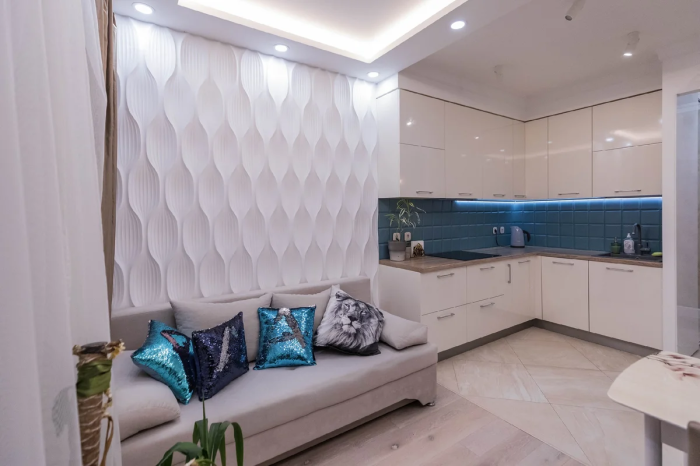Сама же гостиная получилась очень светлой. Два узких окна и прозрачные занавески на окнах привнесли воздушность и объем в небольшое пространство. Чтобы не перегружать имеющуюся площадь разноцветьем и зрительно не выделять гостиную, акцентную стену сделали из фактурных гипсовых панелей белого цвета, которые органично смотрятся в ее интерьере. Основной же палитрой все так же остались молочно-песочные оттенки. Выразительности и свежести добавили лишь яркими вкраплениями в виде блестяще-голубых диванных подушек и комнатных цветов.
