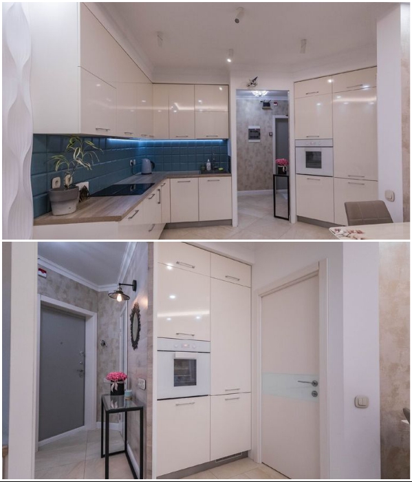 Бело-молочные фасады кухонного гарнитура со встроенной техникой отлично сочетается с песочного оттенка столешницей и напольной плиткой. А вот фактурный фартук с четкими геометрическими фигурами цвета морской волны становится ярким акцентом всей зоны приготовления пищи. Поскольку кухня осталась без окна, то нужно было устанавливать достаточное количество осветительных приборов. В этом случае дизайнер остановила свой выбор на нескольких спотах, которые органично смотрятся на матовом белом потолке.