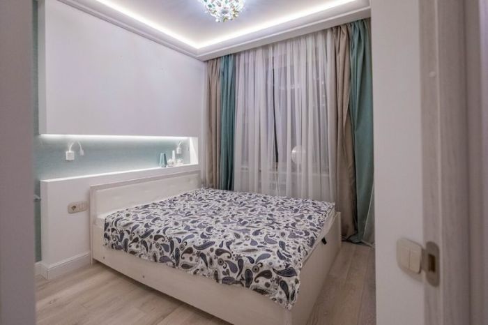 Для спальни осталось совсем мало места, поэтому пришлось отказаться от прикроватных тумбочек, но их недостаток компенсировали за счет создания декоративной надстройки у изголовья. Ее сделали из двух частей, поэтому получилась ниша с полочкой для необходимых мелочей и дополнительных мини-светильников, хотя верхняя часть короба также подсвечена с нижней части.