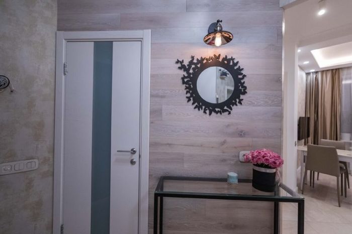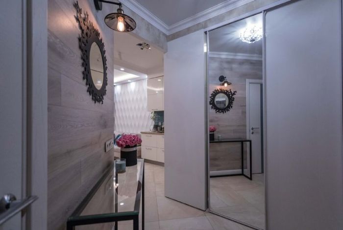 При входе в квартиру удалось создать хоть небольшую, но все-таки прихожую, в которой получилось организовать полноценную гардеробную. Учитывая, что квартира имеет совсем небольшую площадь, выделение зоны хранения позволит избежать нагромождения мебели в спальне и гостиной. Как ни крути, но каждая семья со временем обрастает большим количеством личных вещей и дополнительной техникой, поэтому наличие скрытой гардеробной никому не помешает. В этом же случае было решено ее спрятать за зеркальной раздвижной дверью, чтобы визуально увеличить крошечное пространство и обеспечить прихожую зеркалом во весь рост.