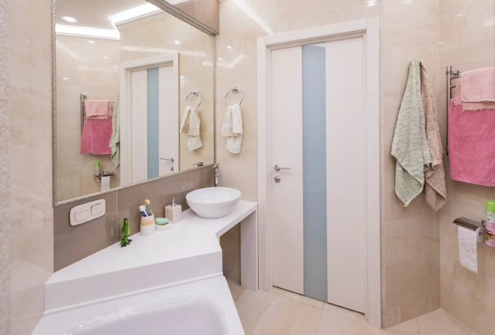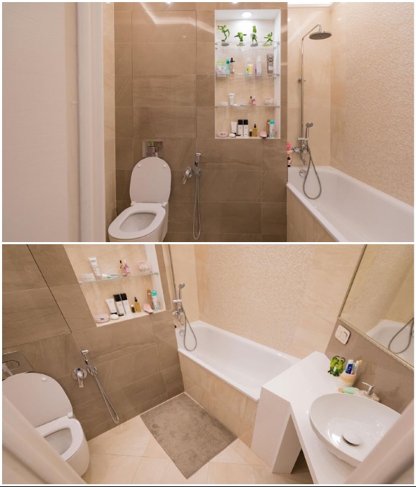 Поскольку расположение ванной комнаты было предусмотрено генеральным планом дома, то менять ничего не стали, да и по закону это запрещено. Громоздкие коммуникации пришлось спрятать за коробом, который облицевали не привычной глянцевой плиткой, а декоративной штукатуркой. Она специальный раствор, который хорошо переносит перепад температур и влагу, не образовывая отслоек или распространения плесени. Такая же отделка повторилась и вдоль стены, где установили полноценную ванну, а вот экран, закрывающий ее нижнюю часть, сделан из керамической плитки, которой покрыли пол. Чтобы придать объема этой комнате, помимо большого зеркала над рукомойником, был установлен вместительный шкаф для банных принадлежностей с глянцевыми фасадами дверей. В общем же, дизайнеру удалось создать расслабляющую и умиротворенную обстановку, грамотно используя бело-песочные тона отделки, мебели и сантехнического оборудования.