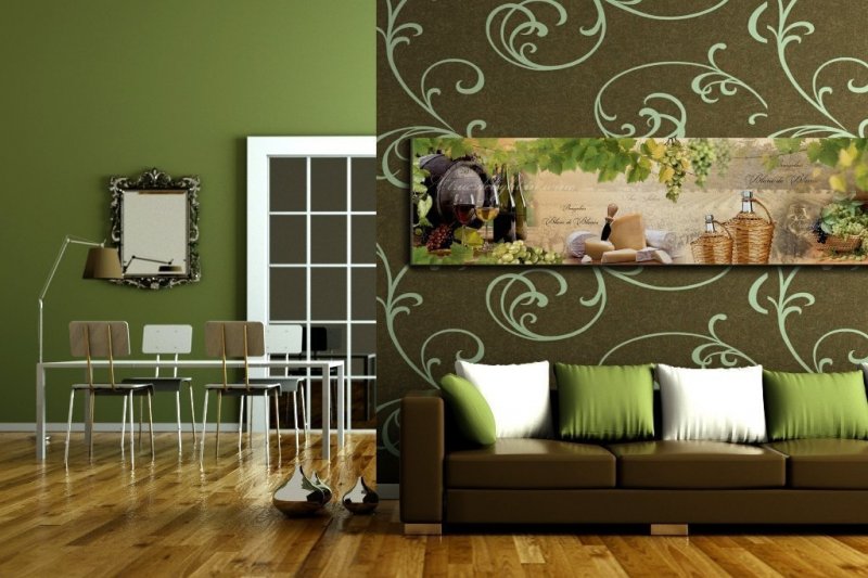 Если выполнить отделку стен исключительно однотонными обоями, то интерьер может показаться скучным. В этом случае достаточно выбрать акцентный участок, который оформляется декоративными полотнами с узорами, принтами. Или для этого подойдут фотообои с изображениями, где преобладают детали зеленых оттенков, пальмы, папоротник, виноград, киви, весенние поля, экзотические кактусы и многое другое. Также однотонные обои прекрасно комбинируются с другими различными оттенками и дополняются акцентными деталями.