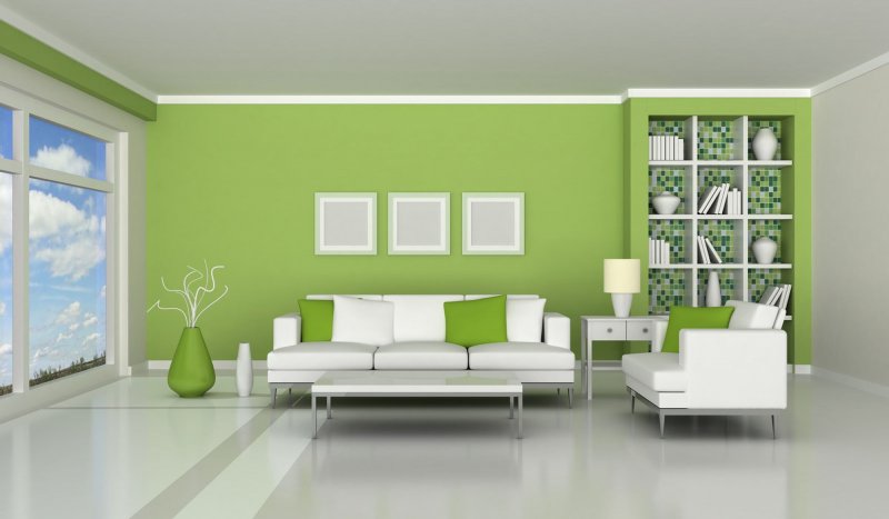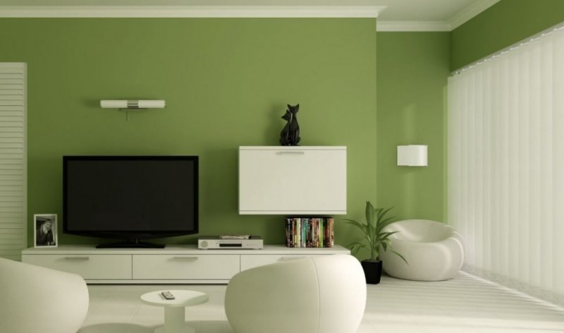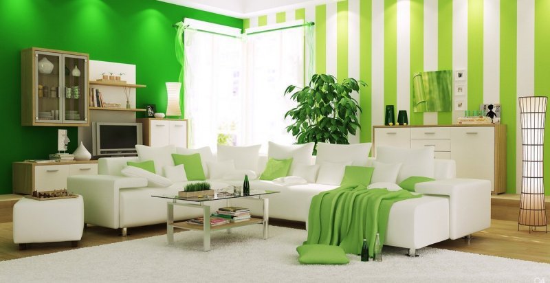 Белый является универсальным, который отлично взаимодействует с любыми другими цветами. Партнерство зеленого с белоснежным будет не только удачным и оригинальным решением, но и является модной тенденцией в современных интерьерах. Подобная комбинация часто встречается в комфортабельных гостиничных номерах и холлах. Такое сочетание комфорта, спокойствия, свежести с чистотой дарит ощущение уверенности и уюта. Визуально делает помещение более просторным и светлым.