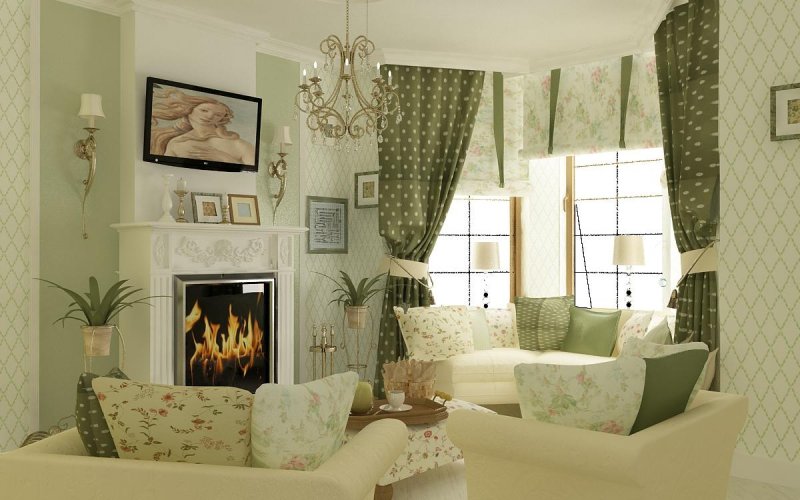 На фоне зеленых стен удачно будут выглядеть белые шторы, которые дополняются розовыми, желтыми, коричневыми декоративными деталями. К темно-оливковым стенам подойдут охровые занавески с коричневыми или серыми элементами. В светло-оливковый интерьер гармонично впишутся светлые желтые и фиолетовые текстильные дополнения. Металлические, серебристые и шторы с позолотой идеально гармонируют с бирюзовой отделкой стен. Серо-зеленое помещение удачно разбавляется темно-красными или сине-зелеными занавесками с бежевыми вставками. К насыщенному нефриту стоит добавить контрастный серый, розовый, шоколадный или бежевый декор. Нежная зеленая гамма прекрасно гармонирует с любыми представителями голубых, синих, желтых и белых оттенков. Замечательным решением будет подобрать текстильный декор, покрывала, подушки в тон к занавескам.