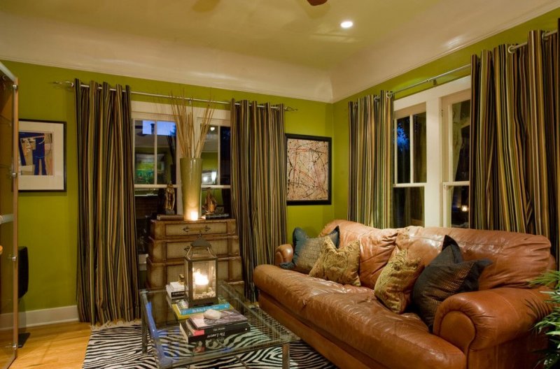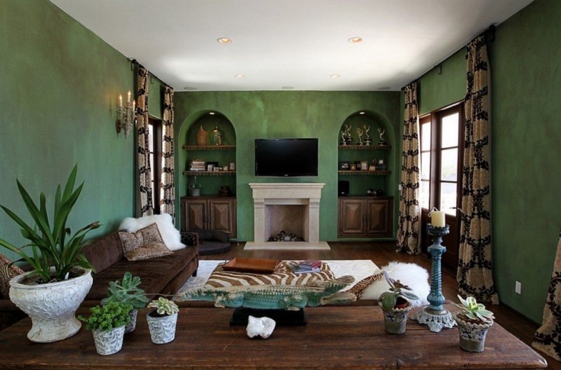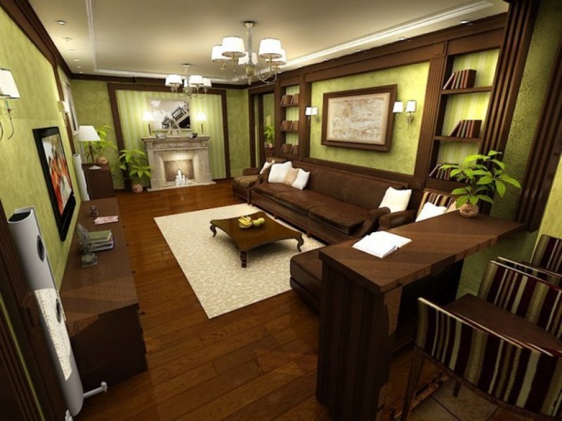 Классическая и беспроигрышная комбинация зеленых оттенков с коричневыми, которая повсеместно применяется в дизайнерских разработках. Цвет дерева и земли идеально гармонирует с природной зеленью весенних полей, лесных чащ, непроходимых джунглей. В этом варианте не должно быть чрезмерно много коричневого, допустимо использование небольших фрагментов на стенах в компании с мебелью и текстильными изделиями.