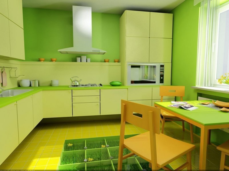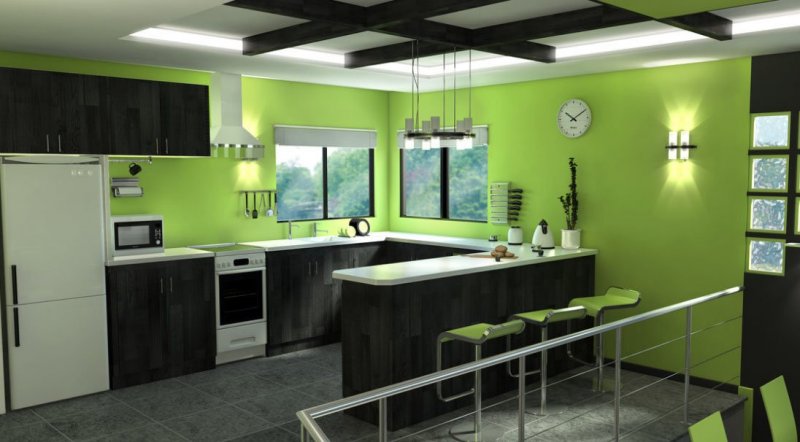 Зеленый создаст на кухне летнее настроение, наполнит ее позитивом и жизненной энергией. Обоями этого цвета смело оформляются все стены или выбирается одна акцентная, функциональная зона, которая будет в окружении других оттенков. Большое количество зеленого следует уравновешивать другими нейтральными тонами. К насыщенным, сочным стенам лучше подойдут полы, потолки и мебель в сдержанных, спокойных и нежных палитрах. Темную гамму допустимо применять лишь в просторных и хорошо освещаемых кухнях, где черные, серые, шоколадные цвета в сочетании с глубоким зеленым создадут стильное и изысканное оформление.