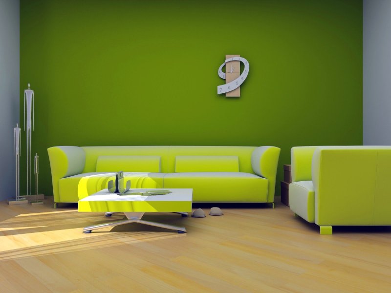 Любые оттенки зеленого идеально гармонируют со всеми расцветками натурального дерева. Именно такая мебель станет самым удачным решением. В маленьких помещениях желательно использовать предметы интерьера светлых деревянных расцветок, а в просторных шикарно будет выглядеть шоколадная мебель венге. Также сам цвет превосходно сочетается со всеми своими разновидностями и полутонами, бирюзовый, изумрудный, салатовый, фисташковый и так далее. Прекрасными компаньонами для зеленого являются родственные представители цветовой палитры, которые расположены с ним рядом, синий, голубой, желтый. Помимо этого можно отыскать и другие удачные сочетания.