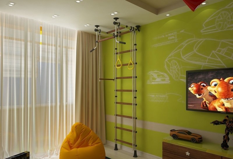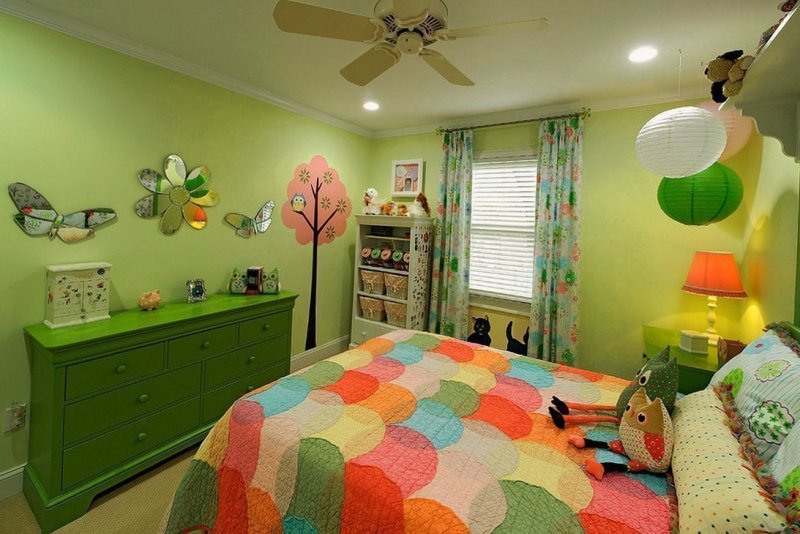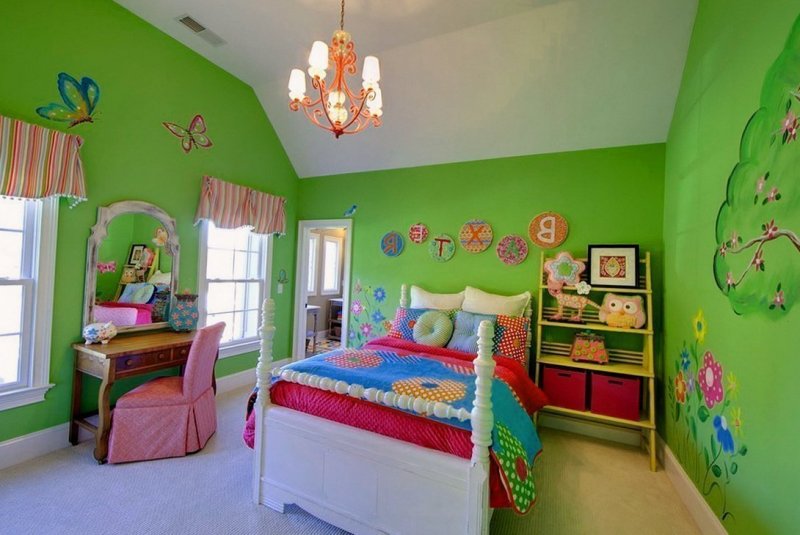 Зеленый цвет является универсальным вариантом, им смело можно оформлять комнату мальчика или девочки. На новорожденных младенцев он будет действовать положительно. Непоседливым и чрезмерно активным малышам поможет успокоиться и сосредоточиться. При правильном сочетании с другими палитрами, тихие и замкнутые дети могут стать более инициативными и веселыми. При этом в детских комнатах рекомендуется комбинировать разные цвета, а не использовать сплошную зеленую гамму. В сочетании с желтым он создаст солнечное и позитивное настроение. Небесно-голубой добавит свежести и подчеркнет спокойствие зеленого. Красные, оранжевые детали, в умеренных количествах, благоприятствуют умственной активности и творческому мышлению. В зону отдыха стоит добавить коричневые элементы мебели, текстиля. Белоснежный привнесет дополнительного простора и чистоты. В продаже легко отыскать рисунки, принты, узоры на обоях стилизованные под детские комнаты, которые выпускаются в большом разнообразии. Также к помещению для ребенка идеально подойдут полотна из натуральных природных материалов, бамбуковые, деревянные.